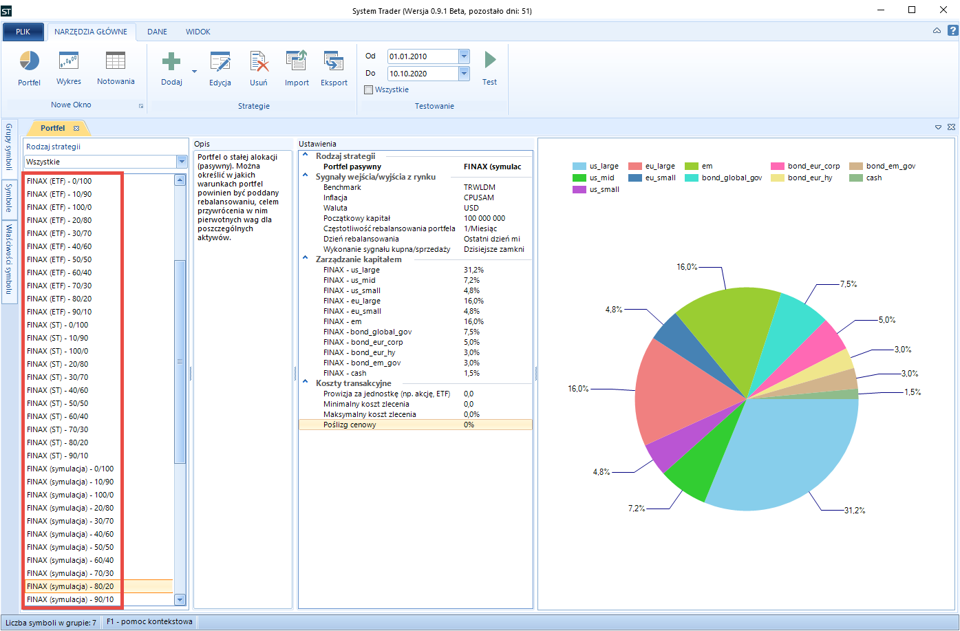 Tak sme vyložili na stôl pred blogerske duo všetky karty spojené s riadením portfólií vo Finaxe. Odhalili sme algoritmy súvisiace s ich tvorbou a rebalansingom. Jacek potom zapriahol do práce svoj softvér System Trader (na obrázku nižšie).