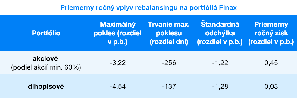 Pre lepšiu ukážku vplyvu rebalansingu na akciové portfóliá (s podielom akcií viac ako 60%) a dlhopisové portfóliá si pozrite nižšie uvedenú tabuľku.
