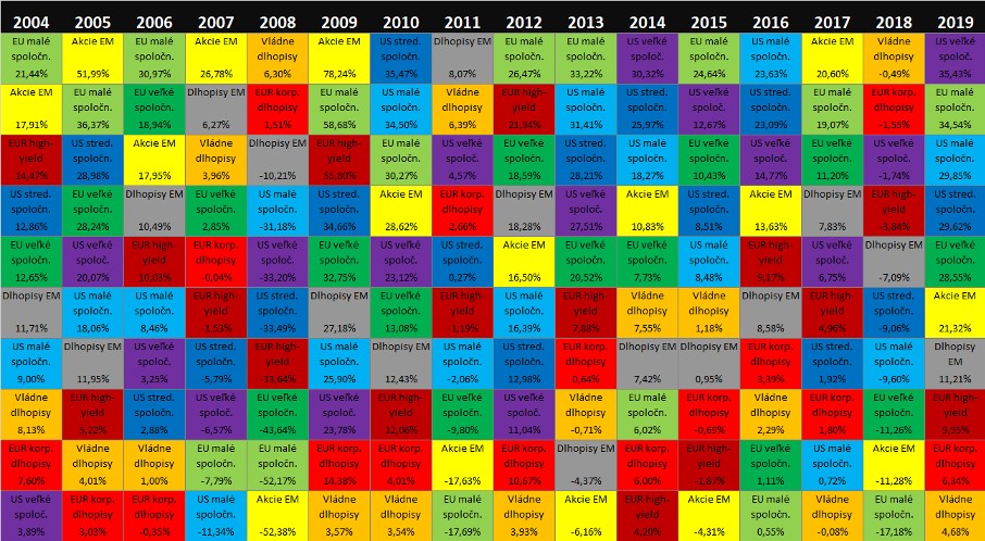 V prvom riadku sú najúspešnejšie aktíva v danom roku. V poslednom riadku sú investície s najhoršou výkonnosťou. Z tejto tabuľky jasne vidieť, že ideálna investícia je v každom roku iná. Spoliehať sa teda len na jeden región alebo len na veľké spoločnosti znamená pripravovať sa o výnos a riskovať viac, ako je potrebné.