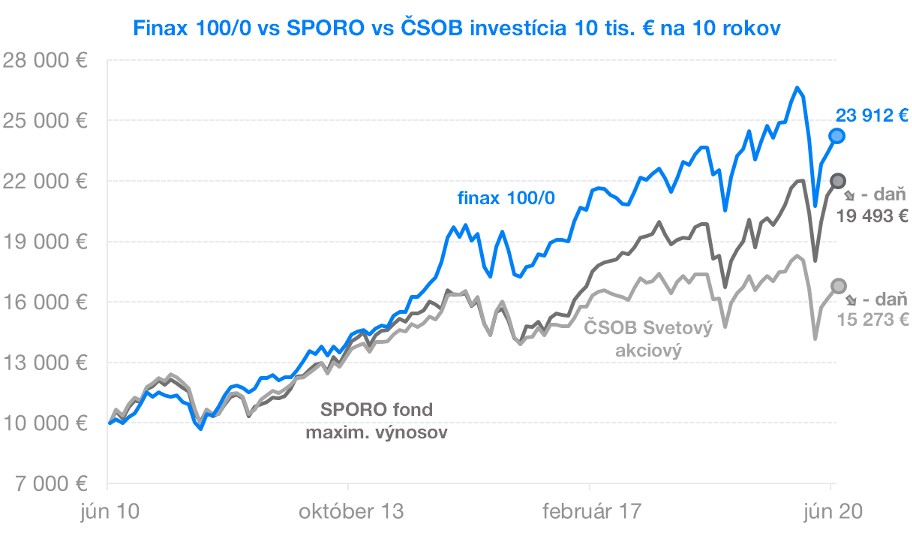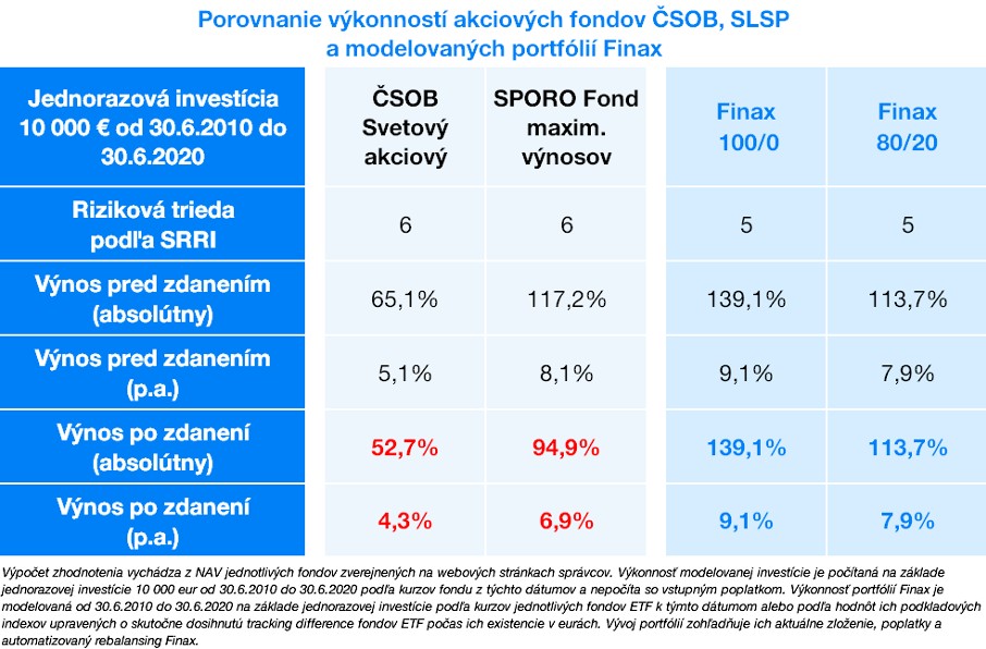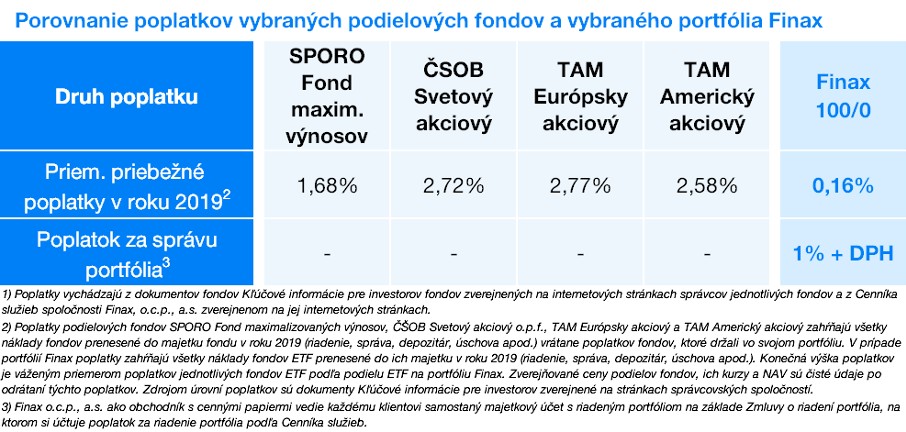 V porovnaní zohľadňujeme len náklady samotného riadenia investícií, teda abstrahujeme od poplatkov platených na vstupe a výstupe z investície, teda od poplatkov za spracovanie platby do 1000 eur a prípadného poplatku za investičné poradenstvo v prípade Finaxu a od vstupných a výstupných poplatkov v prípade podielových fondov.