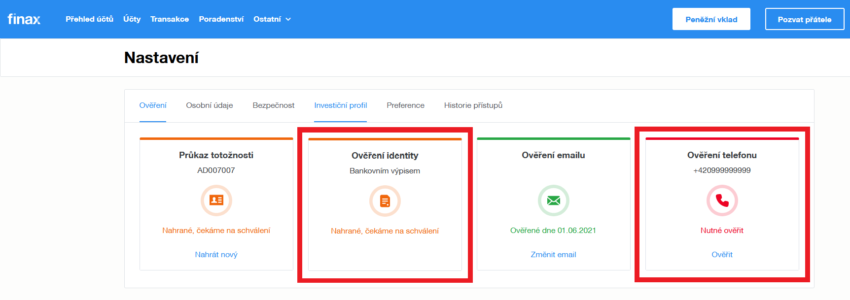 Kontrola identifikačního dokladu může podléhat i manuální kontrole, proto si dávejte pozor na uvedené informace. Proces může trvat delší dobu, pokud chybí doklad, probíhá ověření nebo se nahrané doklady pouze zpracovávají. V případě zpracovávání jen vyčkejte na jeho schválení.