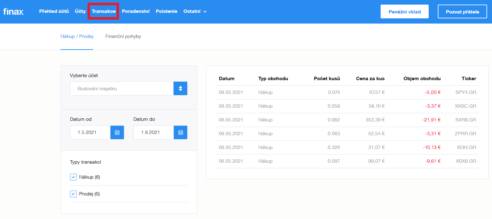 V přehledu Transakcí uvidíte zrealizované obchody po tzv. vypořádání obchodů, tedy dva dny po nákupech.