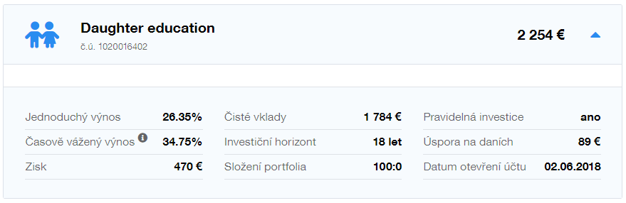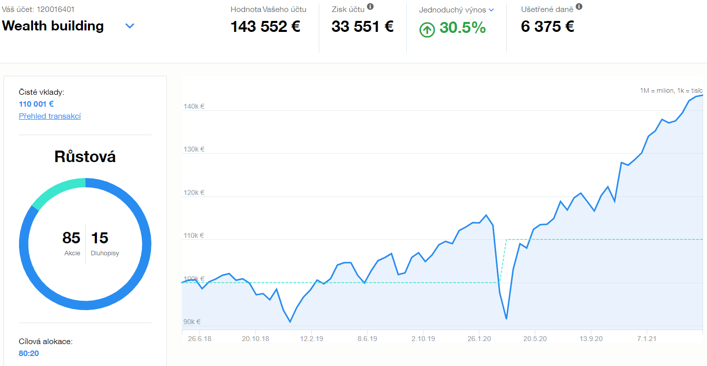 Na druhém účtu se rozhodl investovat 100 000 euro. Tímto účtem chce ukázat, že Inteligentní investování s Finaxem je dnes na Slovensku bezkonkurenční investice z hlediska výnosů, daní, nákladů, pohodlí a jednoduchosti samotného investování.