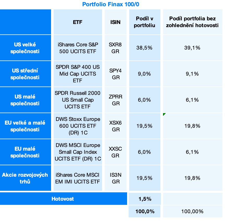 V tabulce výše vidíme, ze kterých ETF se skládá portfolio 100 % akcií. Aby byly výpočty konzistentní, upravili jsme váhy jednotlivých ETF o podíl hotovosti v portfoliu.