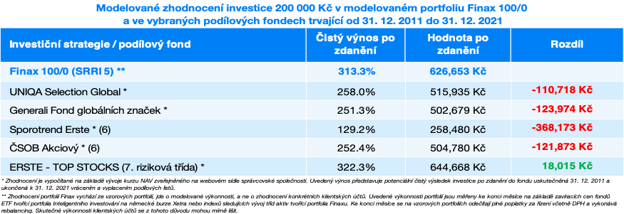 V tabulkách jsme uváděli srovnání čisté výkonnosti po poplatcích a případném zdanění hypotetických investic do modelovaných portfolií Finax a nejpopulárnějších podílových fondů v Česku k datu 31. 12. 2021.