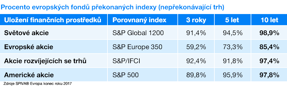 Zde je matematika poměrně jednoduchá. Statistika SPIV (S&P Indices Versus Active) publikována každoročně společností S&P Dow Jones Indices porovnává výkonnost podílových fondů s indexy. SPIV jasně říká, že v Evropě na horizontu 10 let pouze 6,75% podílových fondů překoná výnosy trh.