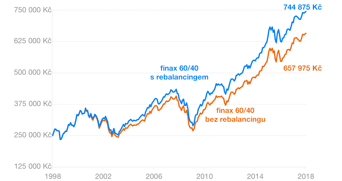 Cílem rebalancování je udržet riziko klientských investic na uzdě, v co největší míře ho eliminovat, a přitom zvýšit výnos. To se nám úspěšně podařilo. Např. za uplynulých 20 let rebalancing přidal k výkonnosti více než 0,6% ročně na dynamických portfoliích Finax.