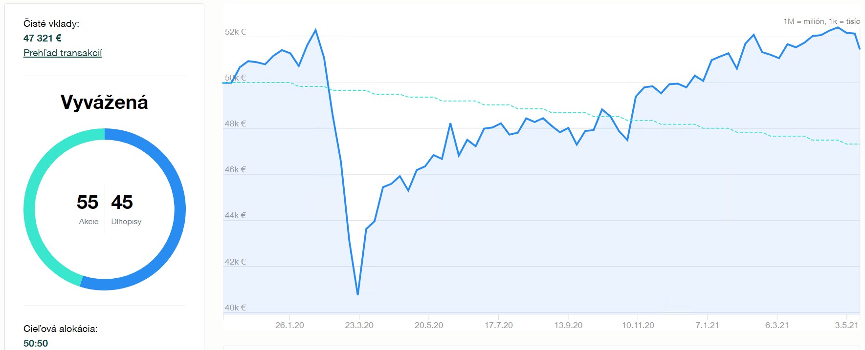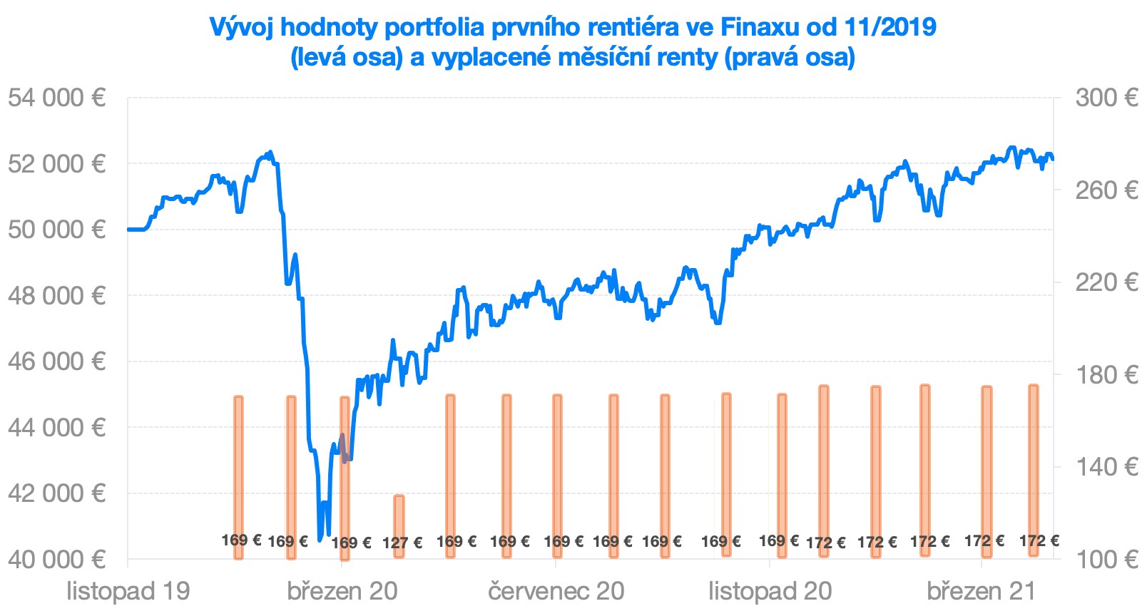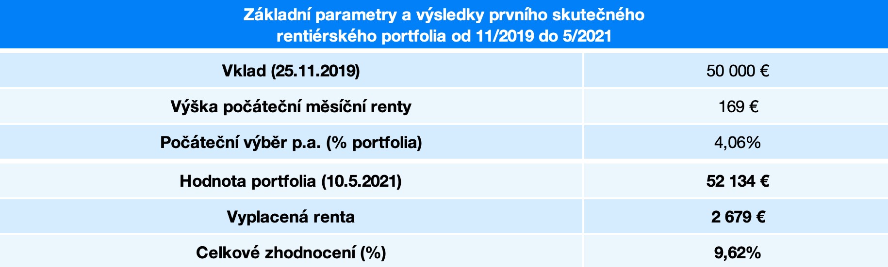 Za více než 1,5 roku je hodnota účtu po pravidelných měsíčních výplatách renty přesahujících 4 % ročně a překonání největšího poklesu akciového trhu od finanční krize vyšší vůči počátečnímu vkladu o 2134 eur(4,27 %, údaje k 10.5.2021).