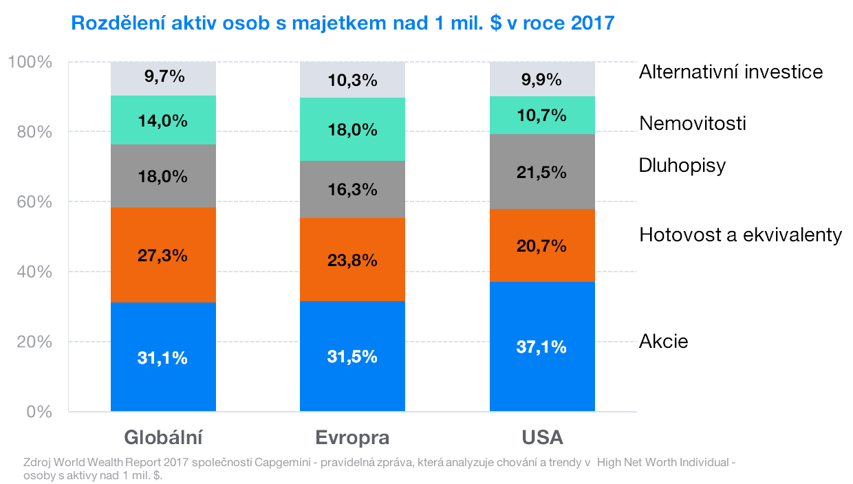 Následující dva grafy ukazují strukturu aktiv a příspěvek jednotlivých tříd aktiv k růstu majetku bohatých lidí v roce 2017 podle pravidelné zprávy World Wealth Report od společnosti Capgemini. V portfoliích dominují akcie – tvoří téměř třetinu majetku.