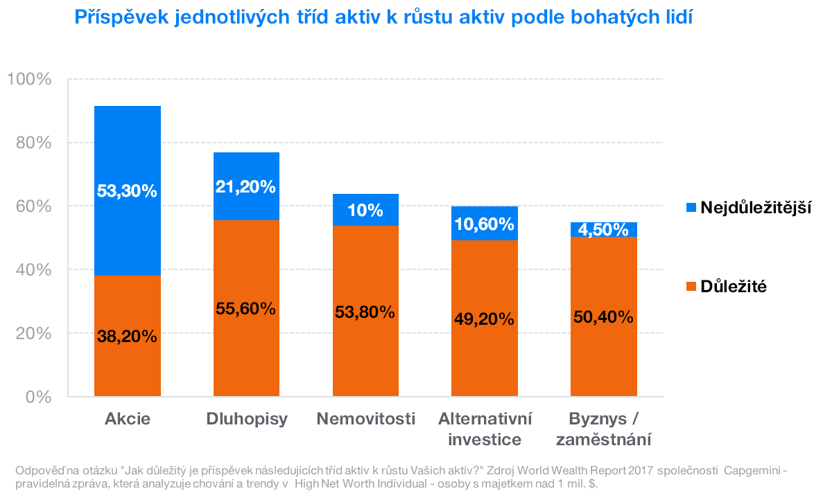 A majetní jednotlivci akciím připisují největší zásluhy na růstu svého majetku - 9 z 10 "boháčů" je vidí jako důležitý faktor zvyšování hodnoty majetku a více než polovina za nejdůležitější. Zajímavým faktem je, že za aktivum s nejmenším příspěvkem k růstu považují příjem z podnikání a zaměstnání.