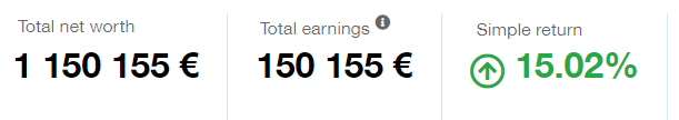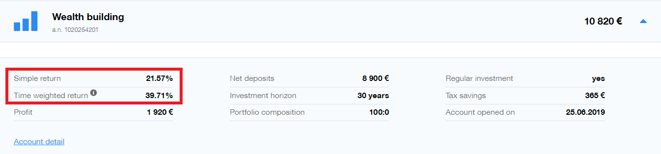 If we translate this figure into comprehensible form, the time-weighted return in 17.47 %. If Mr. Chrenko had invested everything already in May 2019, his current total asset value would be 1 174 700 Euros, so almost 25 000 Euros more than he has today.