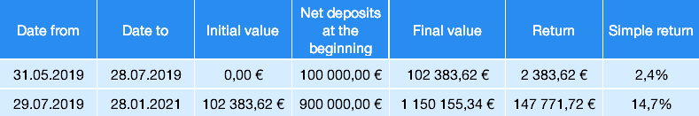 The simple performance is 15.02%. However, when we look at the detail of the account we will see that Mr. Chrenko first made a deposit of 100 000 Euros on May 31, 2019 in order to test Finax out, and only then made an additional deposit of 900 000 on July 27, 2019 – making the total amount of deposits one million. How can we calculate time-weighted return?