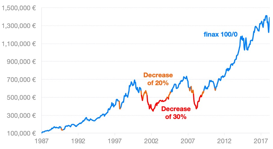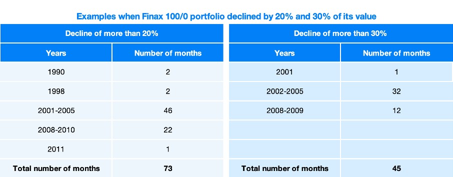Switching off or limiting the withdrawals is dependent on the decrease of the equity component of the portfolio (Finax 100/0) by 20% from its maximum, or as the case may be by 30% from its maximum. The development data, modelled by us from 1 January 1988 to 28 February 2019, show that this portfolio recorded declines of over 20% in 73 months, or rather a decrease of 30% in 45 months.