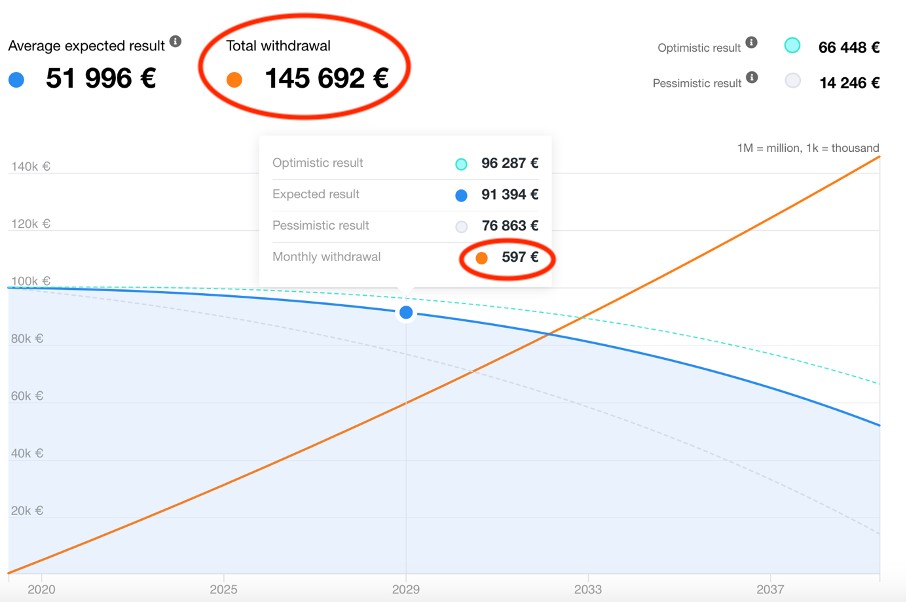 In total, starting with a deposit of 50,000 euros, the client will withdraw 77,160 euros over 20 years and it is still expected that they should have on average 18,000 euros left in their account at the end of the horizon. The client would thus benefit from the original investment in the total amount of 95,160 euros, which is almost twice as much as if it had been kept in the bank account.
