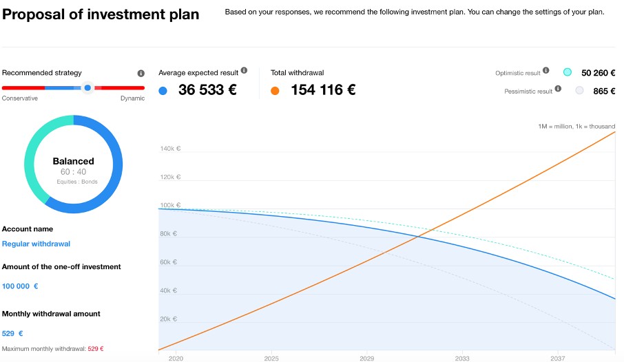 It is more advantageous for clients to have their money invested during such a long period, only selling a small portion of their investment at each withdrawal. The problem arises when you cannot determine how large your withdrawals should be or for how long your portfolio will last. This is when our robo-advisor comes to help.