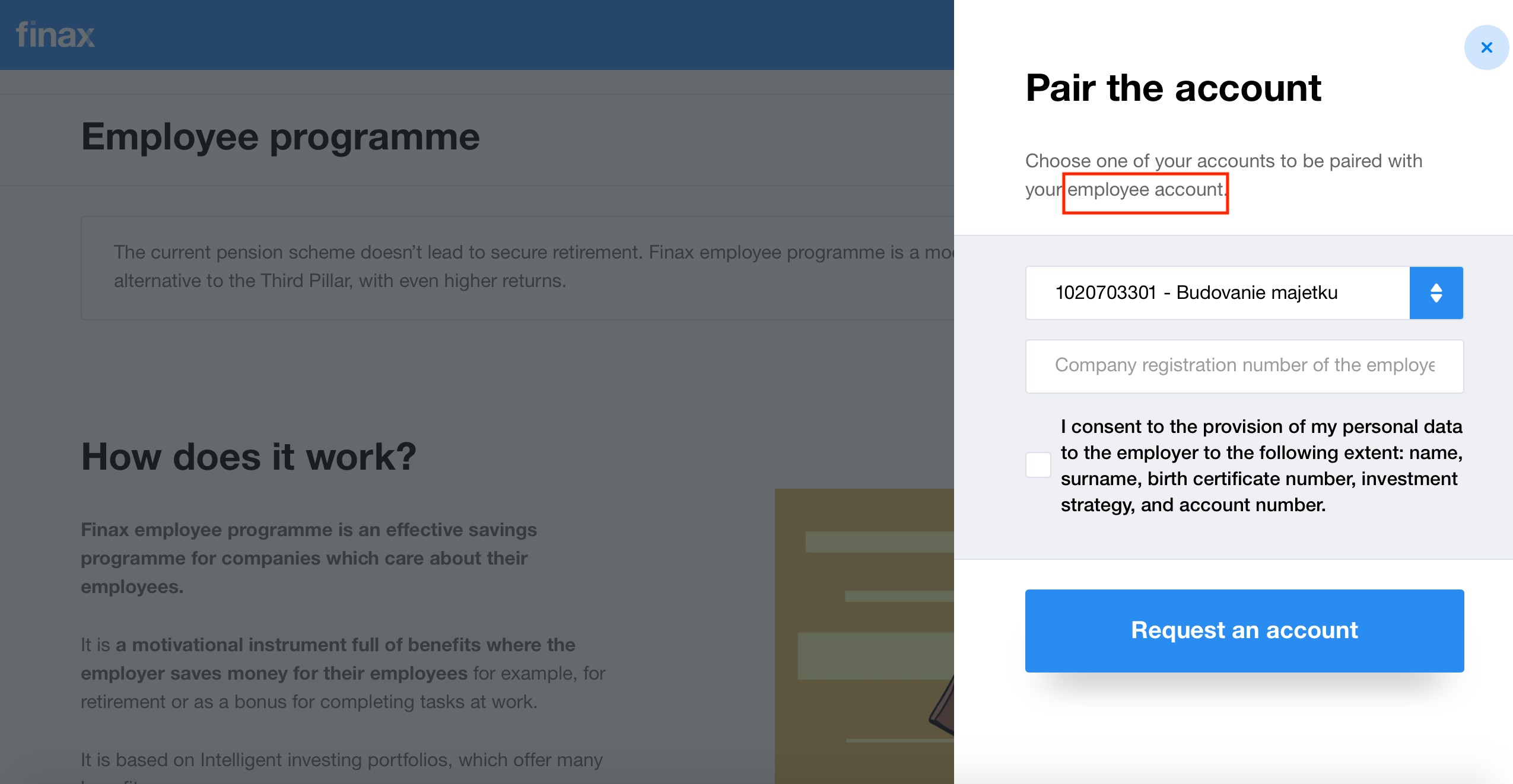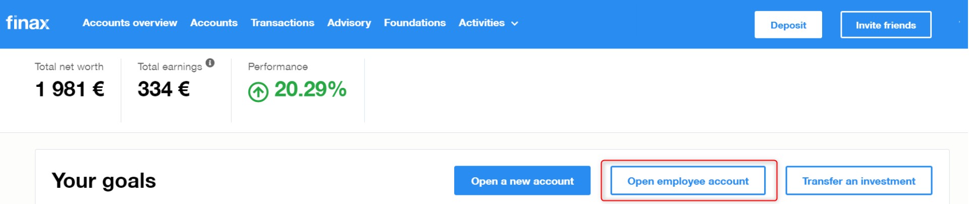 Those involved in the employee program have their own account set up with their employer. You can set it up as well after logging in to your Finax account and clicking the Open employee account button.