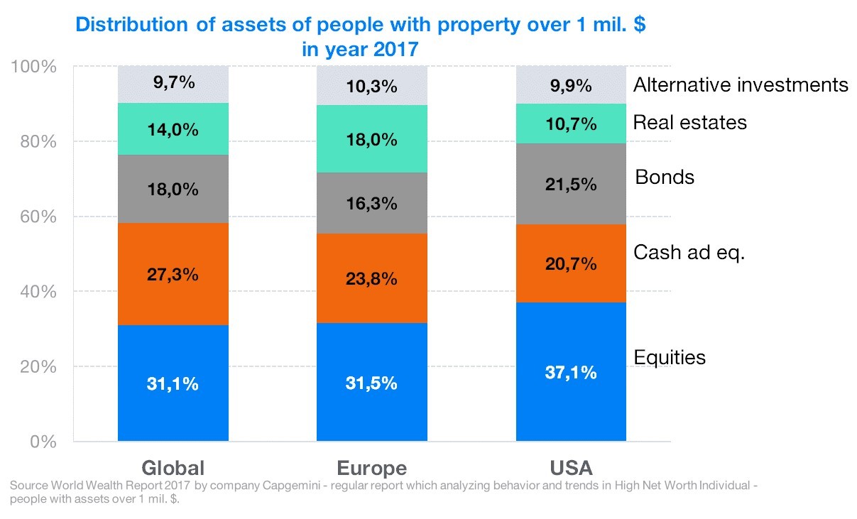 The following two charts show the structure of assets and the contribution of each asset class to the asset growth of wealthy people in 2017 - according to the World Wealth Report from Capgemini. The portfolios are dominated by shares, they account for nearly a third of the portfolio.