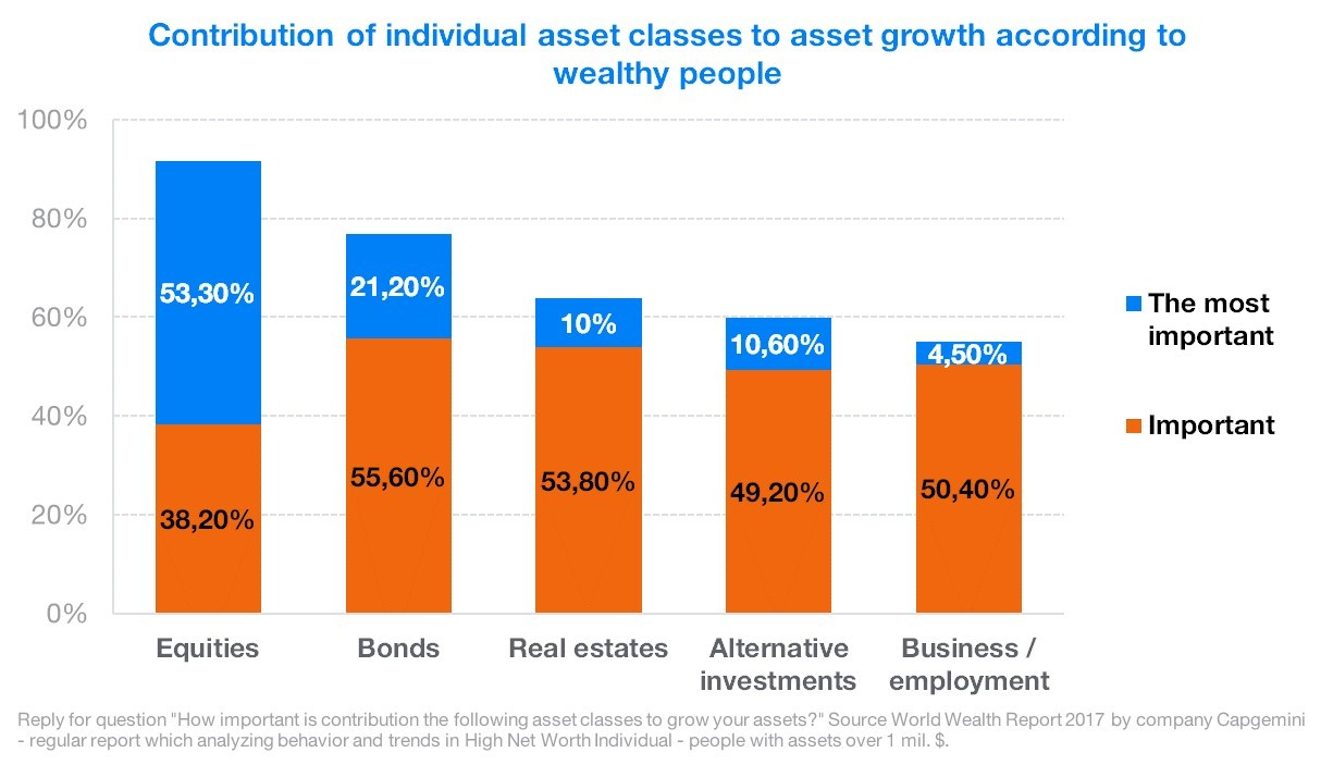 Wealthy individuals attribute equities the greatest credit for the growth of their assets - 9 out of 10 "rich people" see them as an important asset-enhancing factor and more than half as the most important one. Interestingly, they consider income from business and employment to have the smallest contribution to the growth of their wealth.
