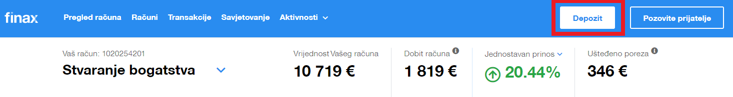 Upute za plaćanje možete pronaći u online pregledu računa klikom na “Depozit“ u gornjoj traci glavnog izbornika. Svakako prvo odaberite investicijski račun na koji želite poslati novac.