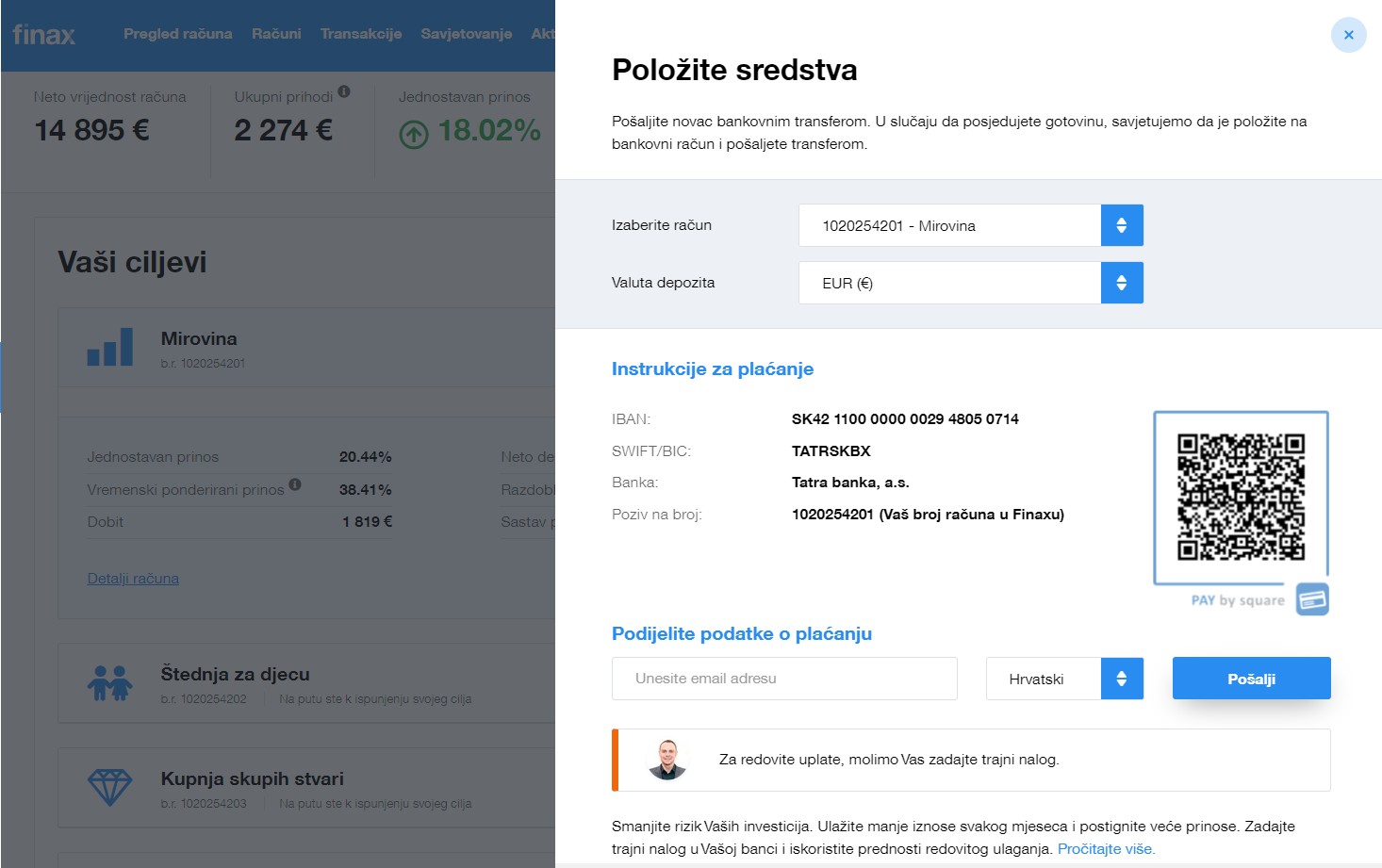 Ne zaboravite uključiti točan simbol u svoju uplatu kako biste odmah povezali svoj depozit sa svojim Finax investicijskim računom.