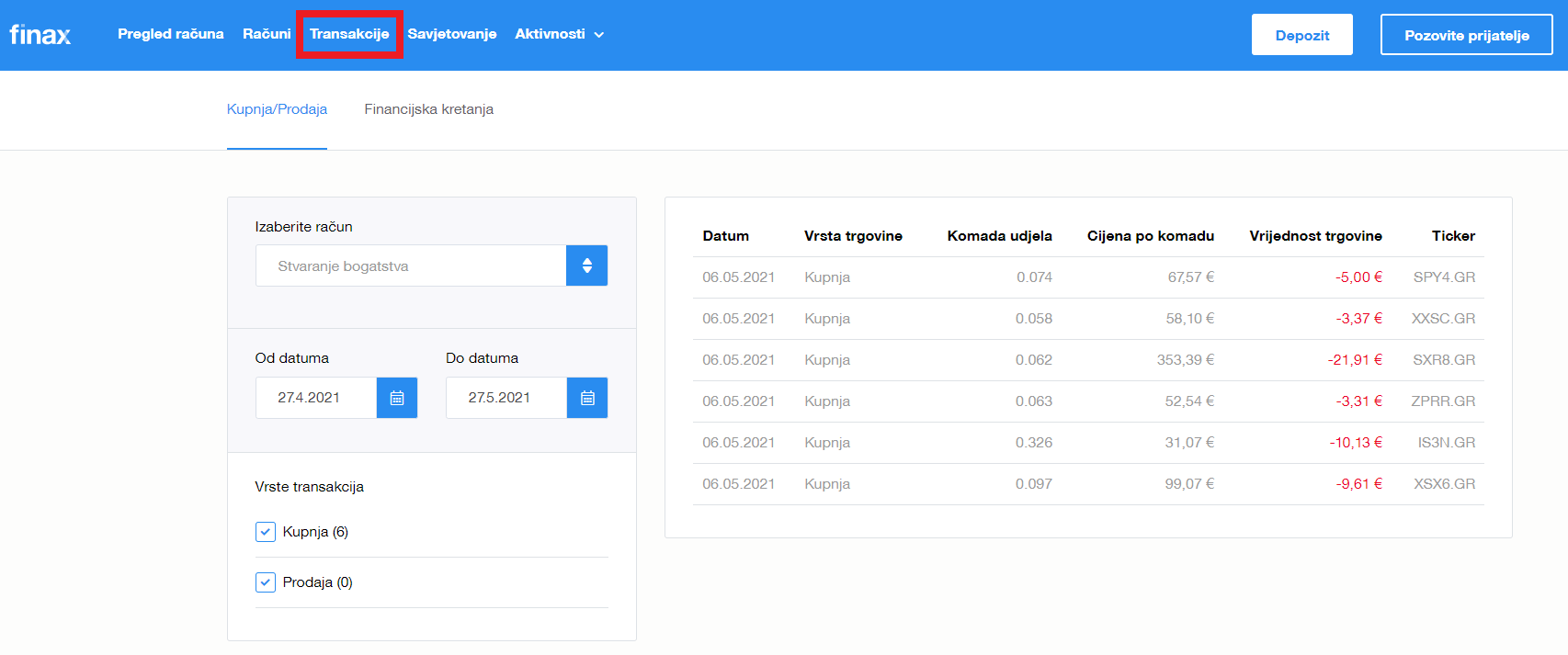 U pregledu Transakcija vidjet ćete izvršene transakcije nakon takozvanog razdoblja namire trgovine, tj. dva dana nakon kupnje.