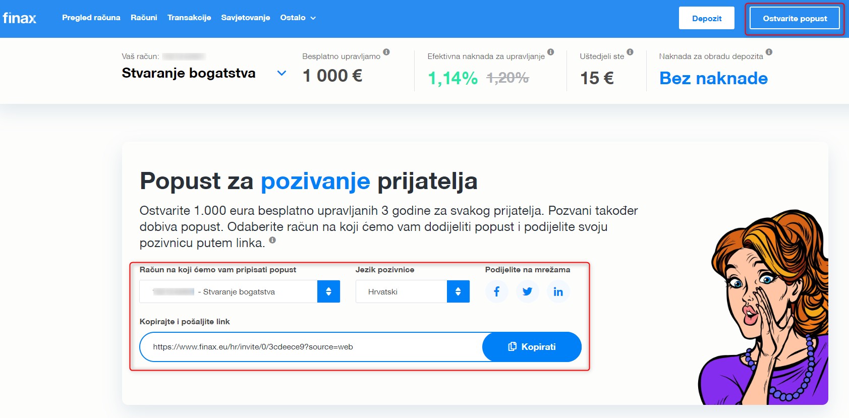 Istovremeno, ovdje možete pozvati prijatelje u Finax - kliknite gumb Pozovi prijatelja. Odaberite račun na koji želite pripisati popust nakon njegove aktivacije, odaberite jezik na kojem želite poslati pozivnicu te ju pošaljite na vama odabran način. Da biste ostvarili popust, sve što treba učiniti je da se vaš prijatelj registrira putem te poveznice/linka.
