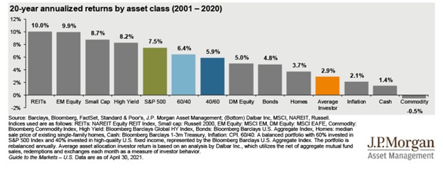 Upravo zato iz ovog grafa JP Morgana možemo vidjeti da prosječan investitor (narančasta boja) ima iznimno loš prinos u usporedbi s ostalim investicijskim klasama:
