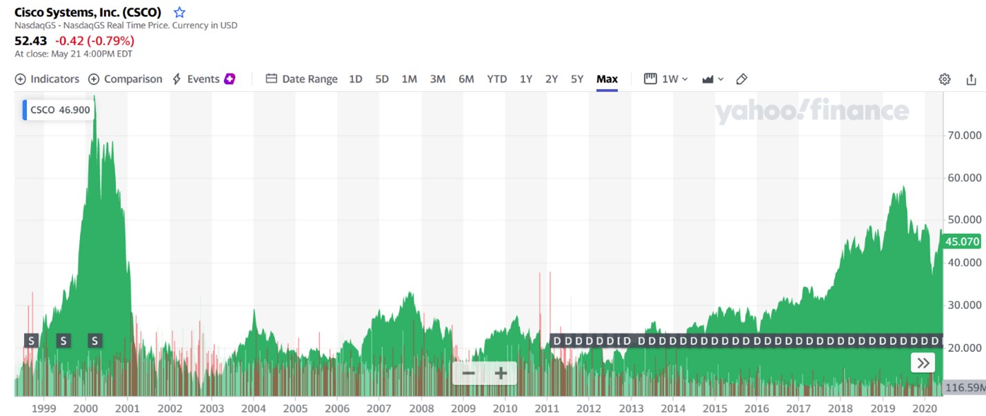 Jednostavno je cijena bila toliko napuhana i skupa da nije imala veze s realnom vrijednošću kompanije. Odličan primjer je Cisco čija dionica je 2000. godine dosegnula razinu od $70, dok se danas, nakon 20 godina trguje na oko $50: