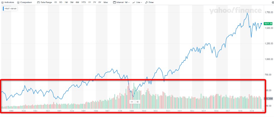 Sljedeći grafikon prikazuje razvoj dioničkog indeksa velikih američkih tvrtki S&P 500 tijekom posljednjih 20 godina. Donji dio grafikona, istaknut crvenim trokutom, prikazuje količinu dionica kojima se trguje. Jasno je da se volumen nije značajno smanjio širenjem ETF – ova, već se, naprotiv, multiplicirao u posljednja dva desetljeća.