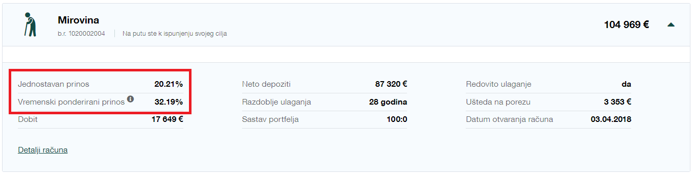 To je skrivena snaga dugog investicijskog razdoblja. Da ste na početku imali novaca, ne biste čekali ili podijelili svoje ulaganje u manje dijelove, zaradili biste točno onoliko koliko dobijete ako umnožite neto depozite s vremenski ponderiranim prinosom.