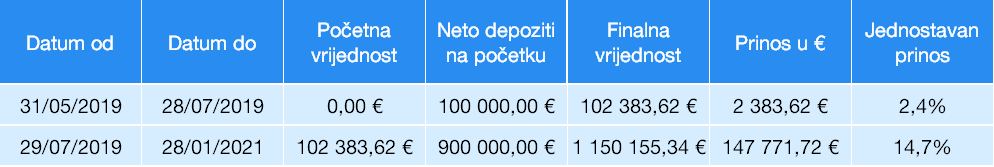 Jednostavna izvedba je 15.02 %. Međutim, kada pogledamo detalje računa, vidjet ćemo da je gospodin Chrenko prvi put dao depozit od 100 000 eura 31. svibnja 2019. godine kako bi testirao Finax, a tek onda dao dodatni depozit od 900 000 eura 27. srpnja 2019. – čineći ukupan iznos depozita milijun eura. Kako možemo izračunati vremenski ponderirani prinos?