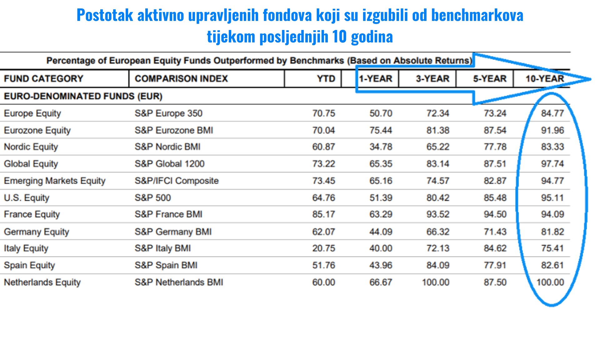 Dopustite mi da objasnim: ako netko ulaže u globalne dioničke fondove u eurima, učinak fondova uspoređuje se s indeksom S&P Global 1200. U prošloj godini 65,3% aktivno upravljanih fondova gubi od ovog benchmarka. U 3-godišnjem horizontu, njih 83,1%, u 5-godišnjem horizontu 87,5% i tijekom desetljeća 97,7%. Drugim riječima, otprilike jedan aktivni fond od pedeset je uspio nadmašiti pasivno (indeksno) ulaganje u posljednjih deset godina.
