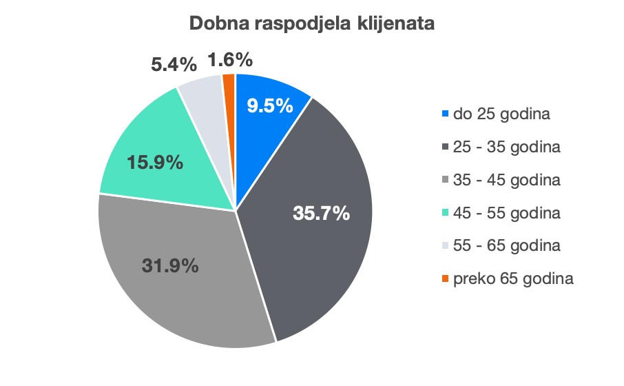 - Broj aktivnih klijenata (aktivirani ugovori sa sredstvima na računu) je na kraju godine dostigao broj od 3846, što predstavlja porast od 464% i ispunjenje cilja od 110% (cilj je bio 3500 aktivnih klijenata).