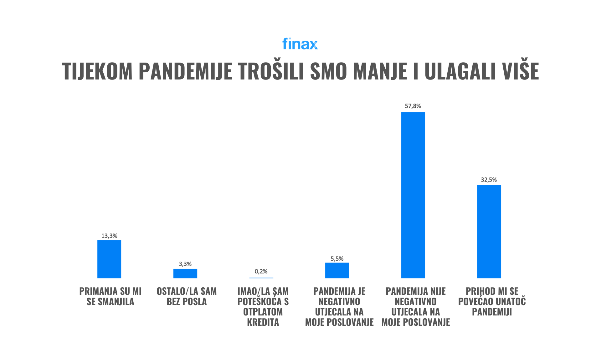 Pandemija nije imala negativan utjecaj na gotovo 58% ispitanika koji su ispitani u svibnju 2021. godine. Zanimljivo je da je takav odgovor navelo i više od 60% ispitanika iz Slovačke, domaćeg tržišta Finaxa. Samo 3% svih ispitanika ostalo je bez posla, a samo su tri osobe izjavile da imaju poteškoća s otplatom kredita.