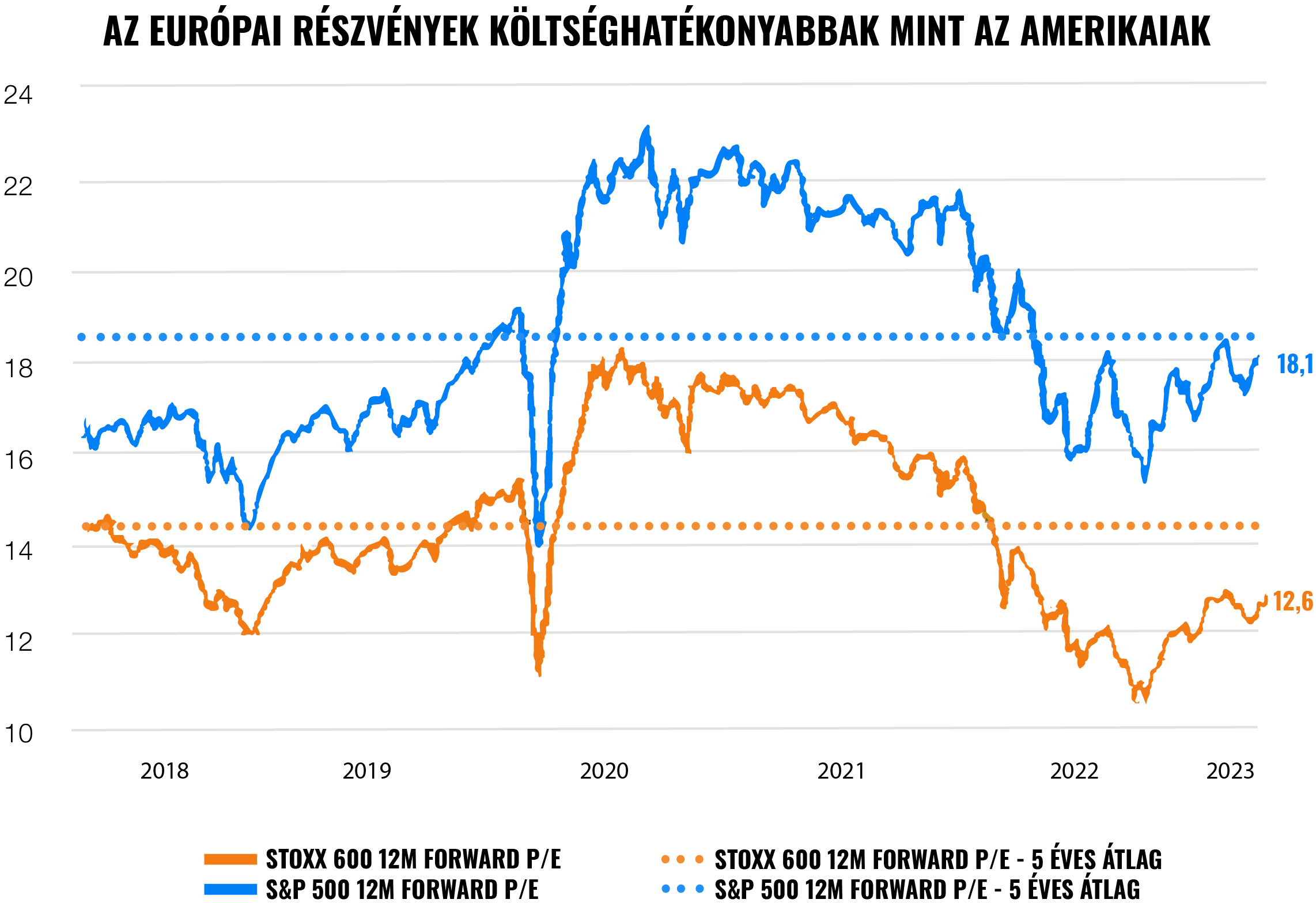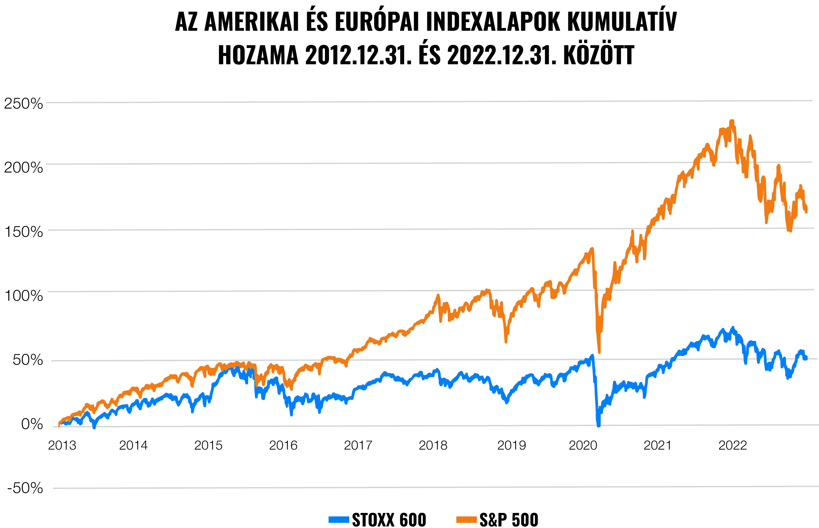 Az elmúlt évtizedben a befektetések világának szupersztárja az amerikai részvénypiac volt. Az amerikai nagyvállalatok indexe, az S&P 500, 2022 decemberéig tartó 10 éves időszakban évente átlagosan több mint 10%-os hozamot ért el. Az európai részvények éves szinten ennek a hozamnak a felét termelték ugyanebben az időszakban.