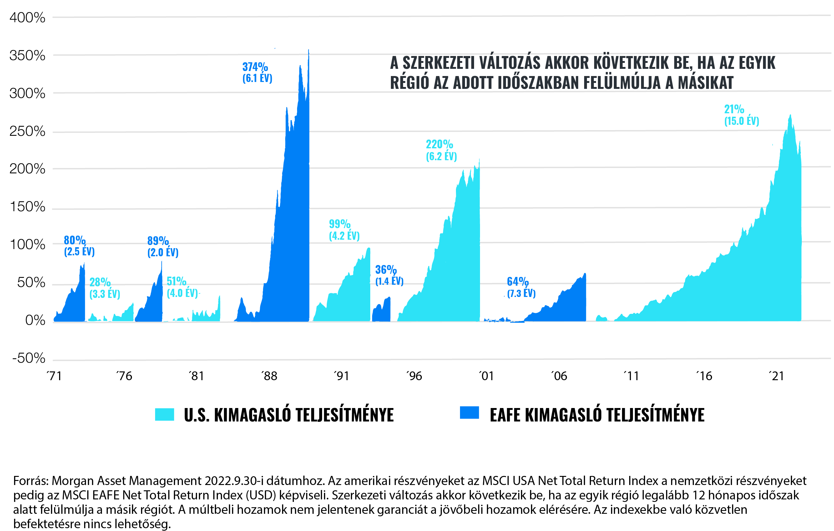A kockázatmegosztás szükségességét a történelmi adatok is alátámasztják. Az alábbi ábra az amerikai részvénypiacok teljesítményét hasonlítja össze az MSCI EAFE Net Total Return Index által képviselt többi fejlett ország teljesítményével. Ez az index 21 fejlett piacot tartalmaz az európai, csendes-óceáni és ázsiai régióból.
