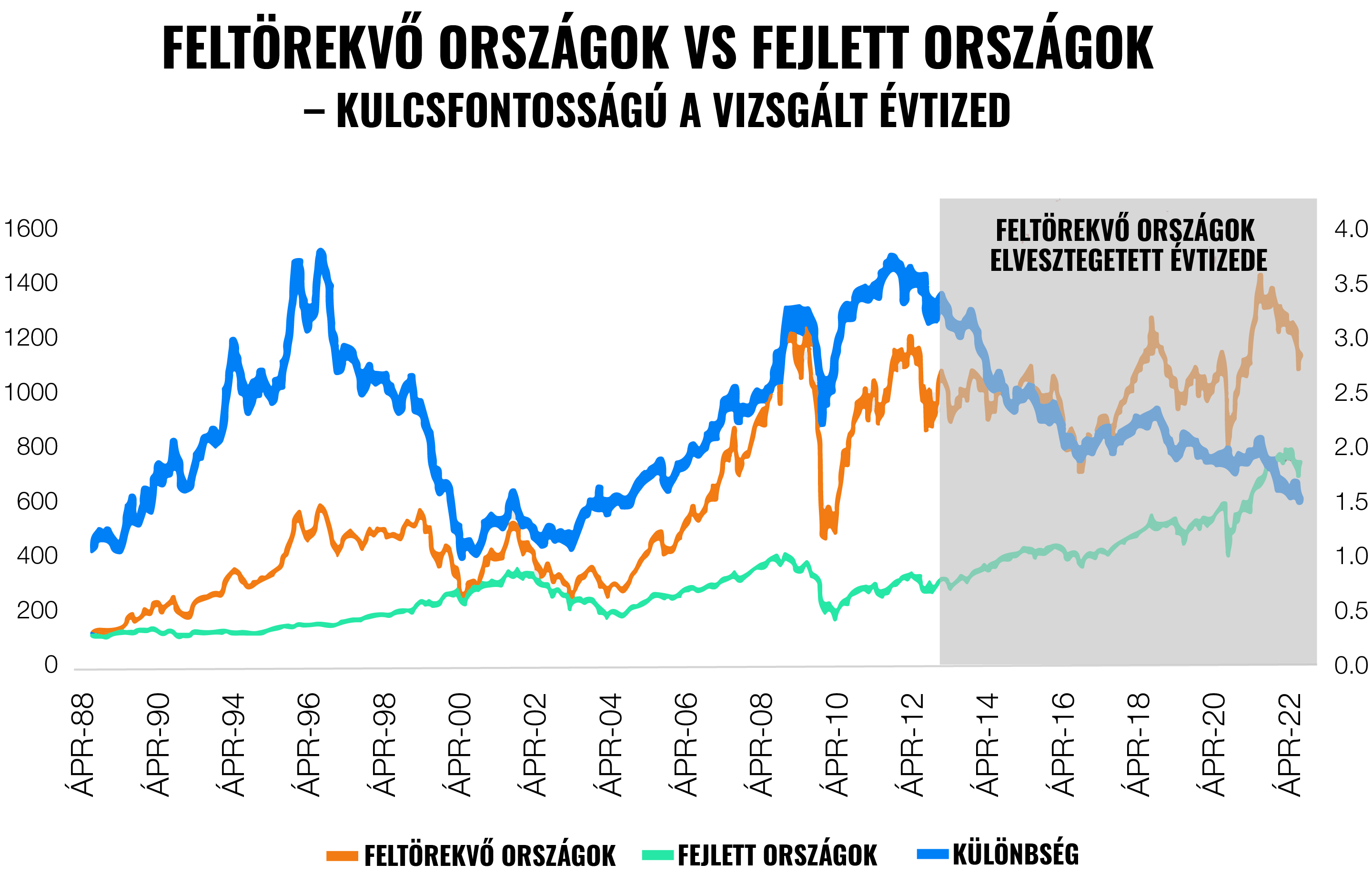 Ugyanez vonatkozik a feltörekvő piacokon történő befektetésekre is. Az alábbi ábra a fejlett és a feltörekvő piaci részvényindexek kumulatív teljesítményét hasonlítja össze.