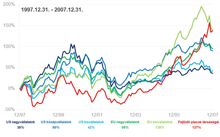 Amint azonban megnézzük ezeket az eszközosztályokat még egy évtizeddel korábban, azaz fejlődésüket 1998 elejétől 2007 végéig, találunk más nyerteseket is. A trendek két évtized alatt teljesen megfordultak.