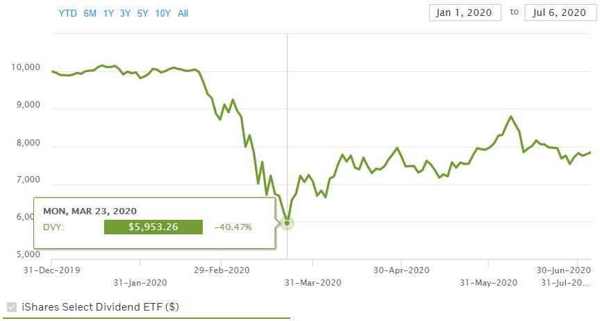 Az osztalékfizető részvények alacsonyabb ingadozását a legjobban ellenőrizhetem a tényleges alakulásuk alapján a széles indexekhez képest. Ehhez ismét két ETF-t fogok használni, az iShares-től a Select Dividendet (DVY) és a széles S&P 500 (IVY) indexet, és ezek alakulását ebben az évben a koronavírussal kapcsolatban mutatom.