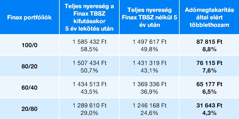 Képzelje el, hogy a hosszútávú befektetését, megtakarítását, valamint azok időhorizontjának betartására tett igyekezetét még plusz adómentességgel is jutalmaznák. Vessen egy pillantást az alábbi példára, amely 1.000.000 Ft, 4 db konkrét Finax portfólióba való Finax TBSZ általi befektetését, valamint az adóhatékonyság elve alapján elért többlethozamot szemlélteti az elmúlt 5 éves időszakban.