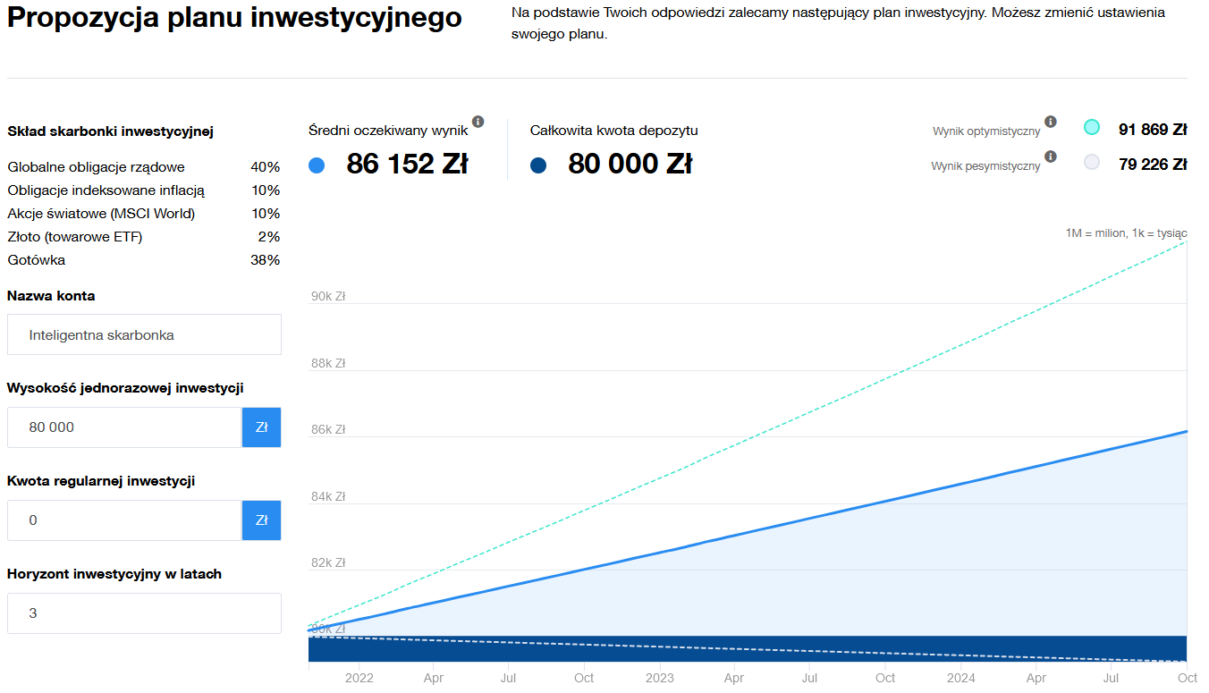 Na powyższym przykładzie widzimy potencjalny wzrost wartości jednorazowej inwestycji w wysokości 80 000 zł zdeponowanej w Skarbonce na okres 3 lat. Średni oczekiwany wynik to 86 152 zl po 3 latach inwestowania przy minimalnym ryzyku. Wart rozważenia, nie sądzisz?