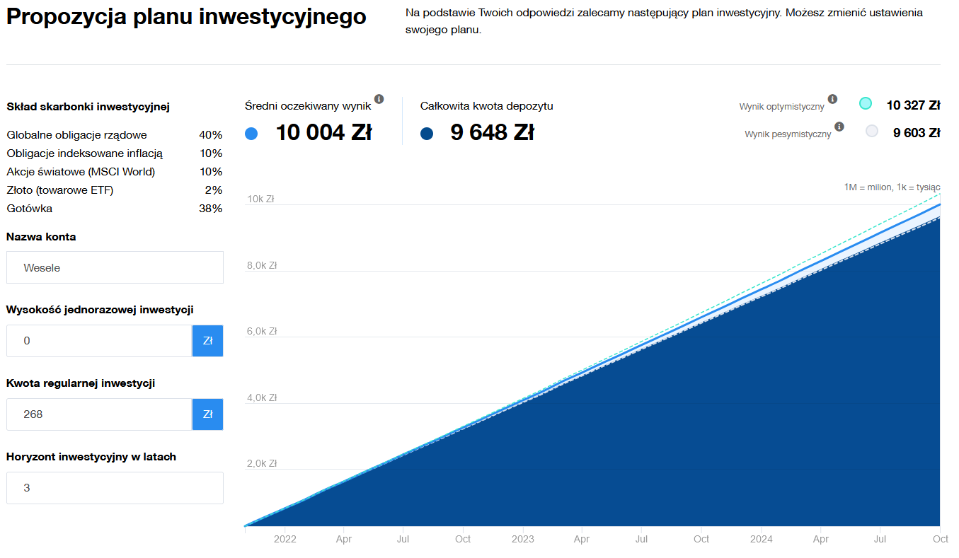 Ponieważ koszt jedzenia, napojów, ubrań i kwiatów stanowić będą dużą część wydatków, Twój budżet będzie szczególnie wrażliwy na wzrost poziomu cen (inflację). Jeżeli nie chcesz polegać wyłącznie na prezentach od rodziny i gości, jak najszybciej stwórz plan finansowy i zacznij oszczędzać. Dzięki Inteligentnej Skarbonce przy inwestycji 268 zł miesięcznie przez 3 lata możesz uzyskać średnio 10 tysięcy złotych.
