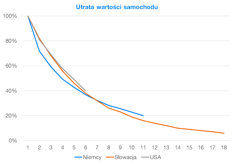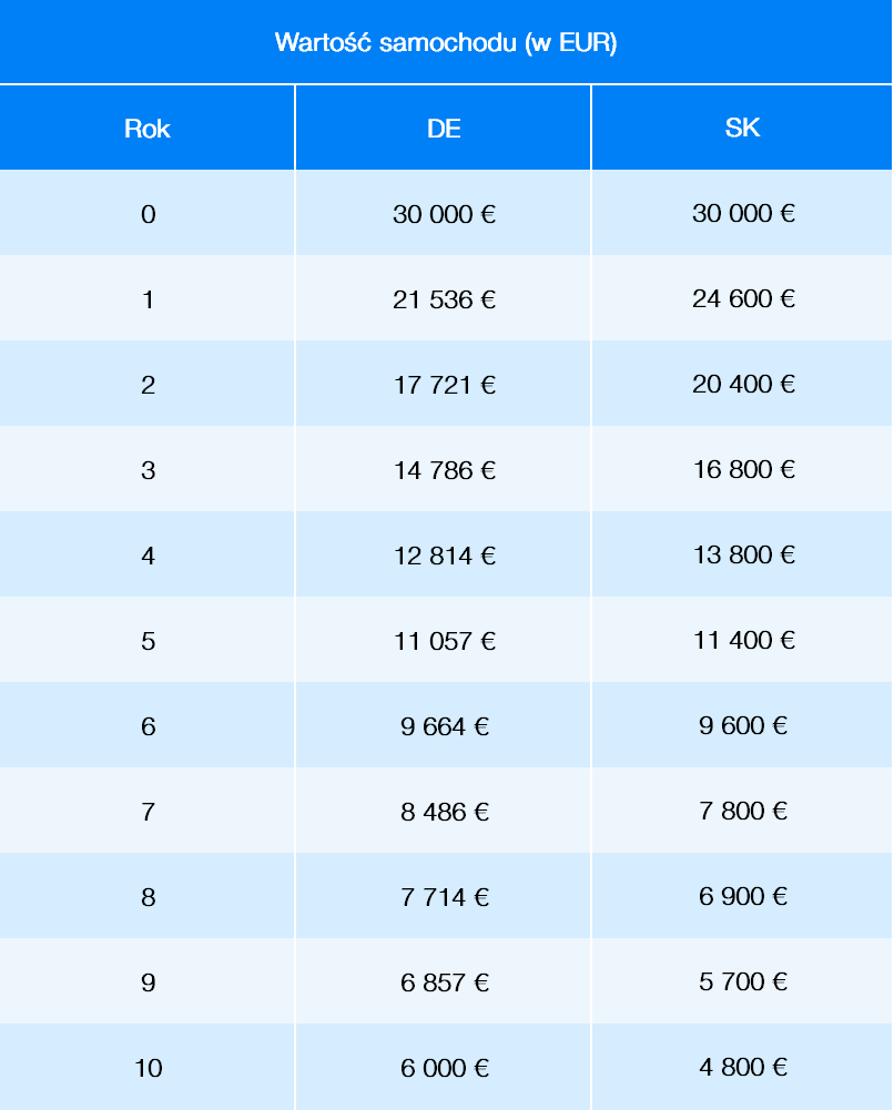 Na powyższym wykresie widać, że spadek wartości samochodów przebiega dosyć podobnie we wszystkich krajach. Dane zostały oparte o szacunkowy roczny przebieg ok. 15 000 km (15 000 mil dla rynku amerykańskiego). Dzięki poniższej tabeli, w której za pierwotną wartość samochodu przyjęliśmy 30 000 EUR, pewne różnice stają się nieco bardziej widoczne: