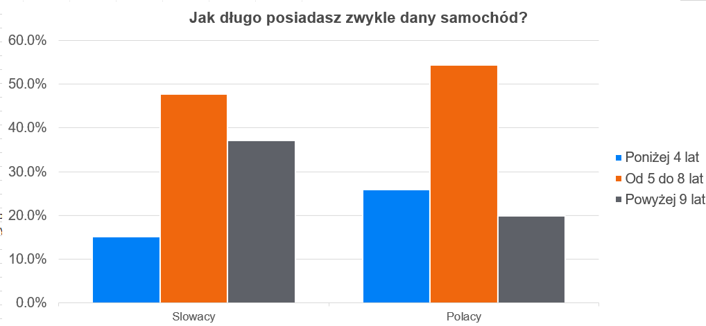 W tym przypadku również istnieje znacząca różnica w odpowiedziach respondentów z Polski i Słowacji, co tym razem wynika głównie z faktu, że polscy respondenci kupowali więcej samochodów używanych, przez co zatrzymują je na krótszy okres.
