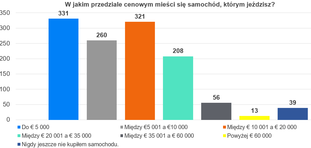 Prawie połowa respondentów jeździ samochodem kupionym za mniej niż 10 000 euro. Na podstawie zgromadzonych danych obliczyłem średnią cenę, za jaką nasi respondenci kupowali swoje samochody, przyjmując środek przedziału jako średnią cenę samochodu w tym przedziale cenowym (dla przykładu, w przedziale 5 000 - 10 000 euro środkową wartością będzie 7 500 euro). Dla cen powyżej 60 000 euro przyjąłem wartość 75 000 euro.