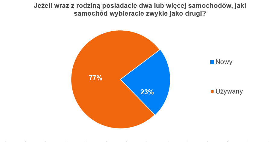 Jak możemy zobaczyć na powyższym wykresie, aż 77% osób posiadających co najmniej dwa samochody na gospodarstwo domowe zdecydowało się na zakup używanego samochodu jako drugiego. To więcej niż w pytaniu o ostatni kupiony samochód, w którym samochody używane stanowiły jedynie 66%. Ludzie chętniej wybierają używany samochód, kupując drugi samochód w rodzinie. Z punktu widzenia budżetu rodzinnego to bardzo dobra decyzja.