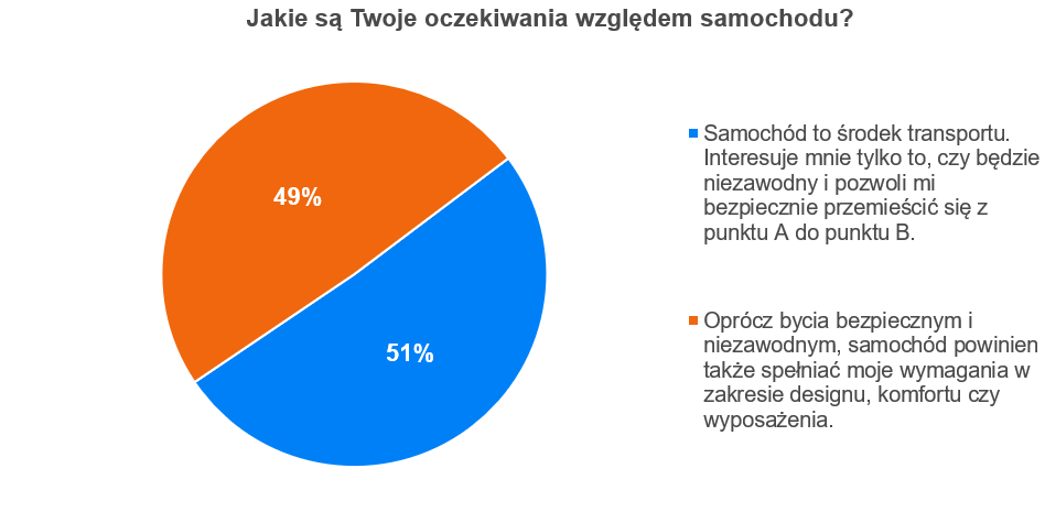 Moje oczekiwania są zbieżne z oczekiwaniami 51% naszych respondentów. Dla drugiej połowy z nich istotną rolę odgrywają jednak również design, komfort oraz wyposażenie samochodu.