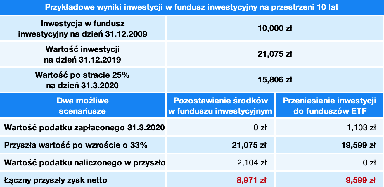 Jak już wspominaliśmy, zyski z funduszy inwestycyjnych podlegają opodatkowaniu. Obecne załamanie na giełdzie przekłada się na fakt, że wycofując się z inwestycji w tym momencie zapłacisz znacznie niższy podatek lub wręcz nie zapłacisz go wcale. Jeżeli natomiast za uzyskaną gotówkę zakupisz ETF-y i zatrzymasz je na ponad rok, nie będziesz musiał płacić podatków od późniejszego wzrostu wartości swojej inwestycji.