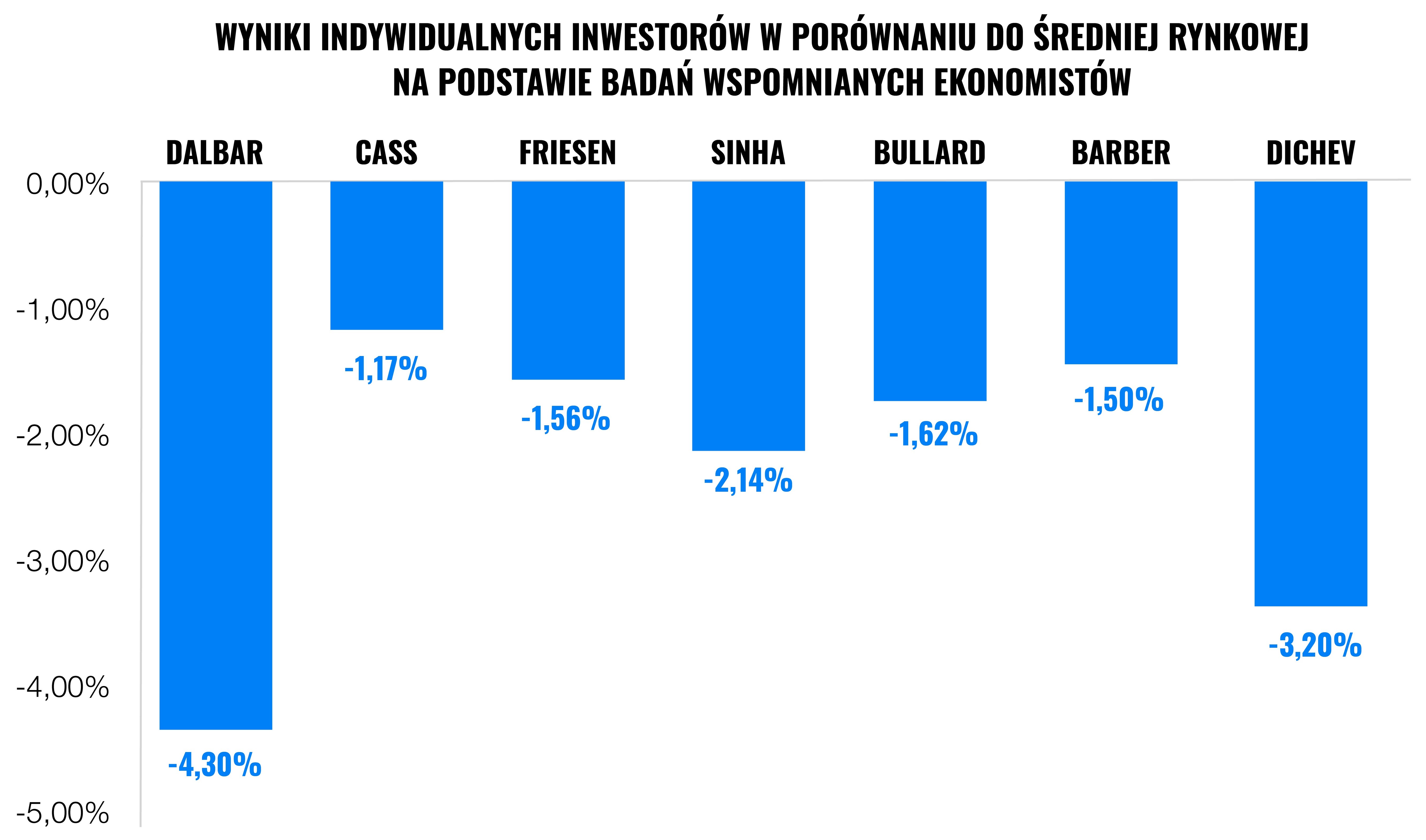Omawiane powyżej badania odkryły, że straty inwestorów z powodu częstych, niepotrzebnych decyzji wynoszą od -1,17% do -4,3% rocznie w stosunku do zysków rynkowych (indeksu).
