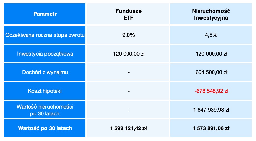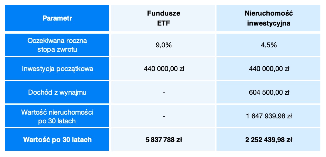 Na uproszczonym przykładzie porównajmy, ile może zarobić dla Ciebie nieruchomość inwestycyjna w porównaniu do funduszy ETF.